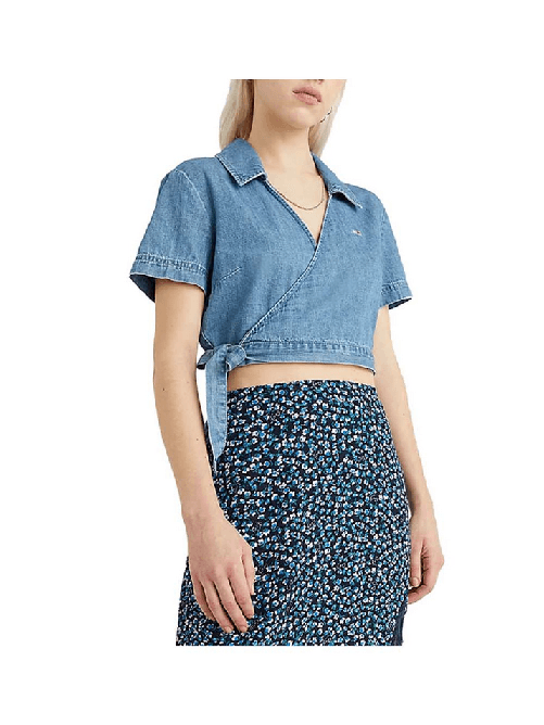 MAGLIA CAMICIA TOP DONNA TOMMY JEANS DW0DW15202 COTONE BLU ORIGINALE PE 2022 M Blu