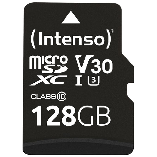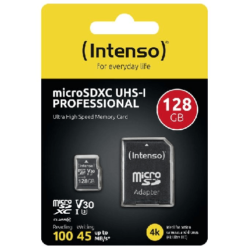 Intenso microSDXC 128GB Class 10 UHS-I Professional - Extended Capacity SD (MicroSDHC). Capacità: 128 GB, Tipo flash card: MicroSDXC, Classe di memoria flash: Classe 10, Tipo di RAM: UHS-I, Velocità di lettura: 100 MB/s, Velocità di scrittura: 45 MB/s, Classe di velocità UHS: Class 3 (U3), Classe di velocità video: V30. Funzioni di protezione: Resistente agli urti, A prova di temperatura, Impermeabile, A prova di raggi X, Colore del prodotto: Nero
