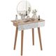 Un design moderno, colori eleganti, e tanto spazio per i tuoi cosmetici. Ecco qui il tavolo da trucco che tutte noi sogniamo. Con 2 comodi cassetti, uno specchio estraibile, un organizer per gioielli e un comodo sgabello abbinato, è perfetto per tenere tutti i tuoi accessori in ordine. La struttura è costruita in pannelli truciolari rivestiti in melammina, in modo da rendere la superficie antigraffio e facile da pulire. Le gambe, in legno di pino, ti offrono la massima stabilità e il massimo comfort. Cosa aspetti, regalati questo fantastico tavolo da toeletta e crea la tua postazione makeup! Caratteristiche: • Set 2 pezzi: tavolo e sgabello; • Costruito con pannelli truciolari di grado E1 rivestiti in melammina; • Gambe in legno di pino; • 2 cassetti e un organizer per gioielli e trucchi; • Sgabello con un morbido cuscino imbottito; • Specchio estraibile; • Montaggio richiesto; Dati tecnici: • Colore: Color legno; • Materiale: Pannello truciolare, Gommapiuma, Pelle PU; • Dimensioni generali: 100L x 45P x 118Acm; • Dimensioni sgabello: 40L x 24P x 45Acm; • Dimensioni specchio: 34P x 37Acm; • Dimensioni interne cassetto: 23L x 35P x 8Acm; • Capacità di peso: 70kg (piano del tavolo), 80kg (sgabello), 10kg (cassetto); Contenuto della confezione: 1 x tavolo da trucco; 1 x sgabello; 1 x manuale istruzioni